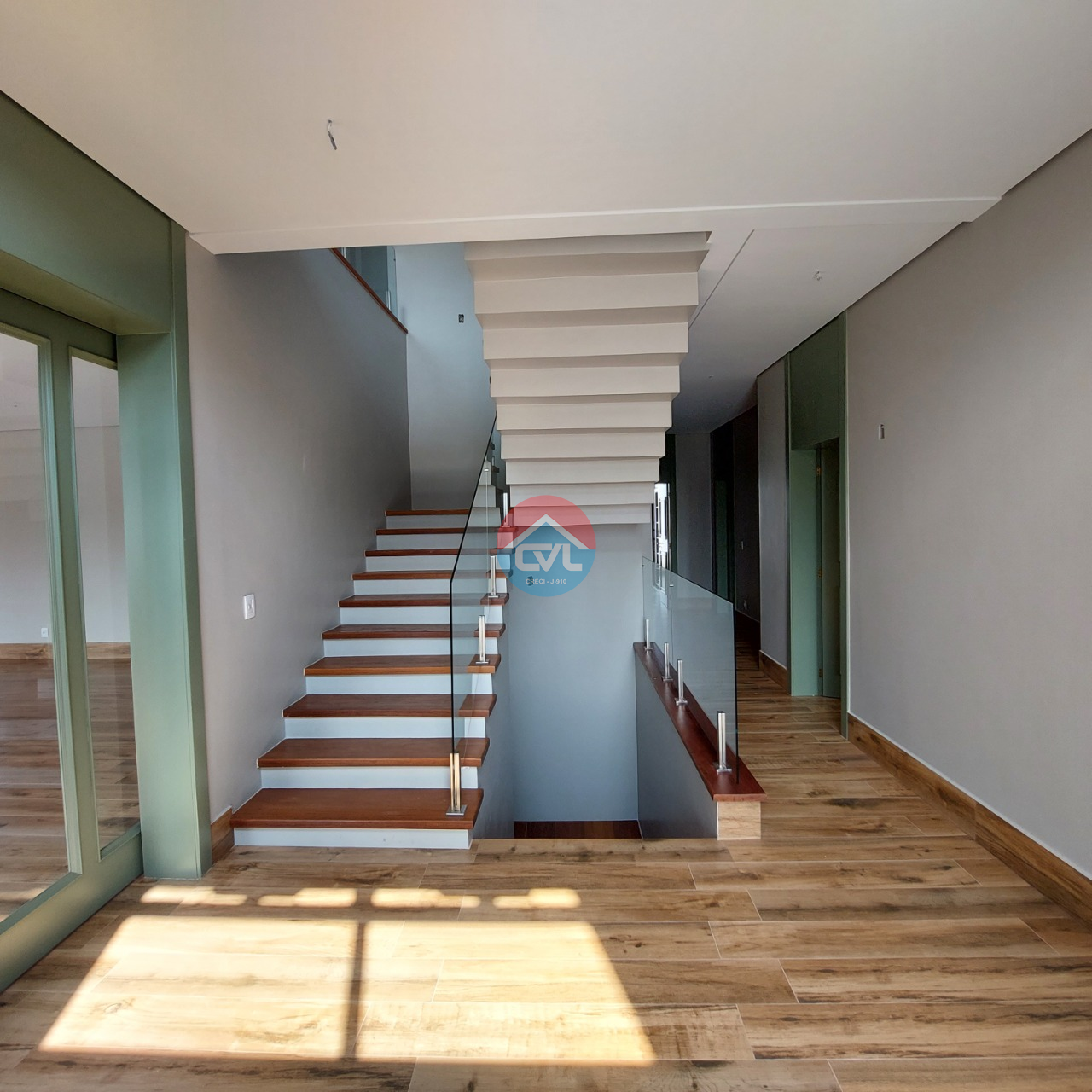 Escada revestida em madeira natural;